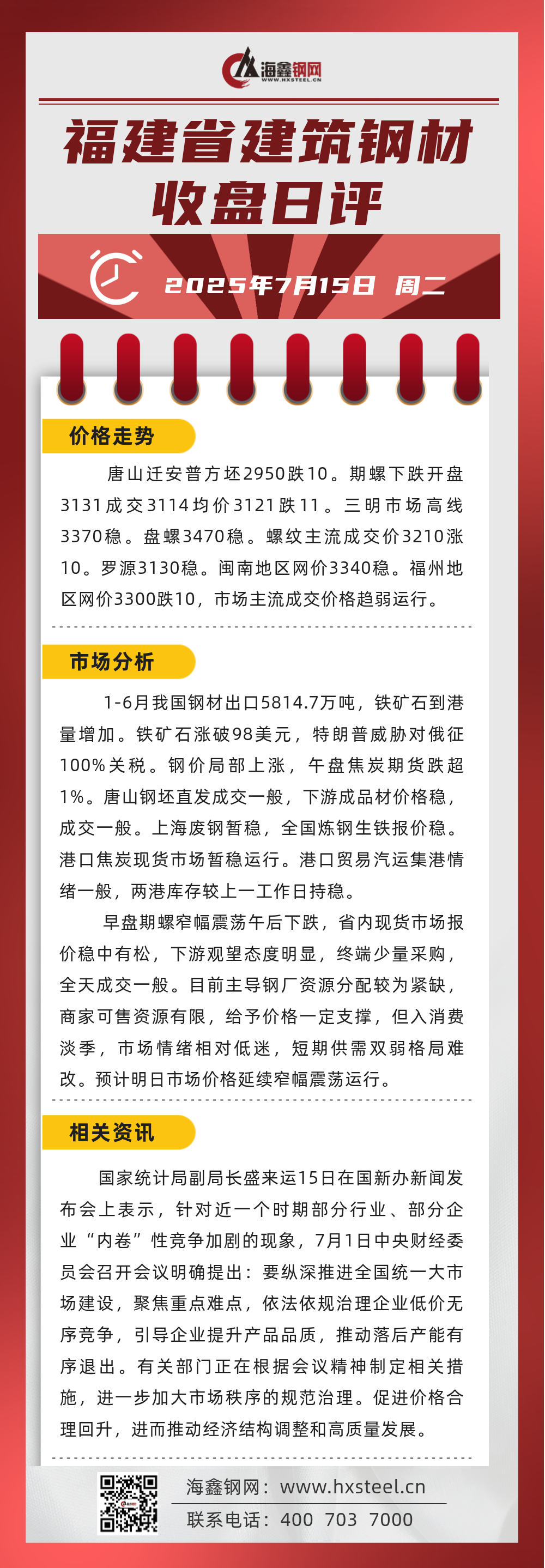 7月15日福建省內(nèi)建筑鋼材收盤日評(píng)