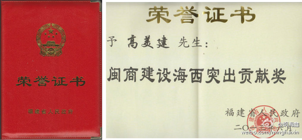 近日,福建省人民政府發(fā)出《關(guān)于表彰閩商建設(shè)海西作出突出貢獻(xiàn)獎(jiǎng)的決定》( 閩政文〔2013〕215號(hào)),表彰廣大閩商為海峽西岸經(jīng)濟(jì)區(qū)建設(shè)作出的積極貢獻(xiàn),全省共有238位非公有制經(jīng)濟(jì)人士獲得“閩商建設(shè)海西作出突出貢獻(xiàn)獎(jiǎng)”。其中福建明海鑫企業(yè)股份有限公司董事長(zhǎng)高美建先生獲此榮譽(yù)。