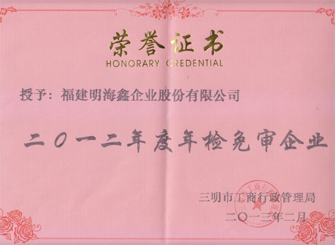 2013年二月份,福建明海鑫企業股份有限公司被三明市工商行政管理局授予二0一二年度年檢免審企業。